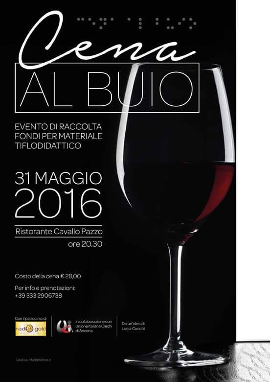 ‘Una cena al buio’ per raccogliere fondi per acquistare materiale tiflodidattico in collaborazione con Unione italiana ciechi di Ancona. L’evento è stato organizzato a Fabriano da una idea di Lucia Cucchi. L’appuntamento è per domani, 31 maggio, alle ore 20,30, presso il ristorante Cavallo Pazzo. Per maggiori informazioni: 333-2906738. Media partner Radio Gold Fabriano.