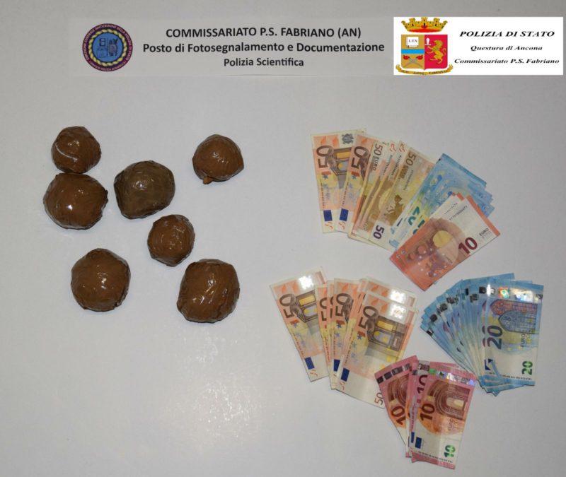 Un nigeriano di 27 anni residente da tempo nel quartiere Borgo di Fabriano, A. A. le sue iniziali, è stato arrestato dai poliziotti agli ordini del commissario Capo, Sandro Tommasi. Aveva quasi 400 grammi di marijuana nascosta nel giacchetto e 1.350 euro in contanti (foto). Era sorvegliato da tempo per la sua condotta sospetta e per il giro di persone che passeggiavano intorno all’abitazione.  Questa mattina all’alba è scattato il blitz. La pattuglia ha approfittato della presenza di un giovane che aveva suonato alla porta per fare irruzione in casa. Sono stati rinvenuti quasi 400 grammi di marijuana confezionata con nastro adesivo marrone da pacchi. La droga era stata suddivisa all’interno di 7 palline di cellophane nascoste nelle maniche di un giacchetto posto in uno sgabuzzino poi occultato con panni sporchi. Il giovane è stato arrestato e, per evitare il pericolo di fuga, verrà trattenuto nella camera di sicurezza del commissariato. Già nel 2015 dopo essere stato sorpreso con la droga, era riuscito a dileguarsi beccandosi anche una denuncia per resistenza a pubblico ufficiale. Domani si svolgerà la direttissima presso il Tribunale di Ancona. Indagini in corso sugli assuntori del comprensorio che, da tempo, si rifornivano da lui di marijuana.