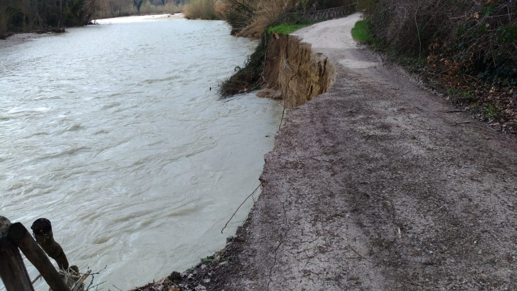 Jesi – Il maltempo degli ultimi mesi e le ripetute piene dell’Esino hanno causato una forte erosione di un tratto della sponda sinistra all’interno della Riserva Naturale Ripa Bianca. Ne è derivato il crollo di parte della strada di accesso, per un tratto di circa venti metri. La zona coinvolta è immediatamente dopo il cancello di ingresso ed ha di fatto costretto l’immediata chiusura dell’area protetta, in attesa di una soluzione alternativa per la viabilità, almeno quella pedonale. Rinviata pertanto a data da destinarsi la passeggiata notturna in programma questa sera per celebrare l’evento mondiale Earth Horu – l’Ora della terra e annullate le visite già programmate per domenica. “Mentre gli interventi di difesa di tratti di sponda in erosione realizzati nel 2016 in collaborazione tra Riserva Ripa Bianca e Provincia di Ancona hanno evitato ulteriori dissesti – spiega il direttore della Riserva David Belfiori – purtroppo un nuovo tratto di sponda fluviale sinistra ha visto una progressiva erosione fino ad interessare, mercoledì scorso, la strada di accesso all’area protetta. Ciò ha comportato anche la rottura di una tubazione dell’acquedotto con conseguente interruzione della fornitura idrica alla sede e al Centro di Educazione Ambientale”.