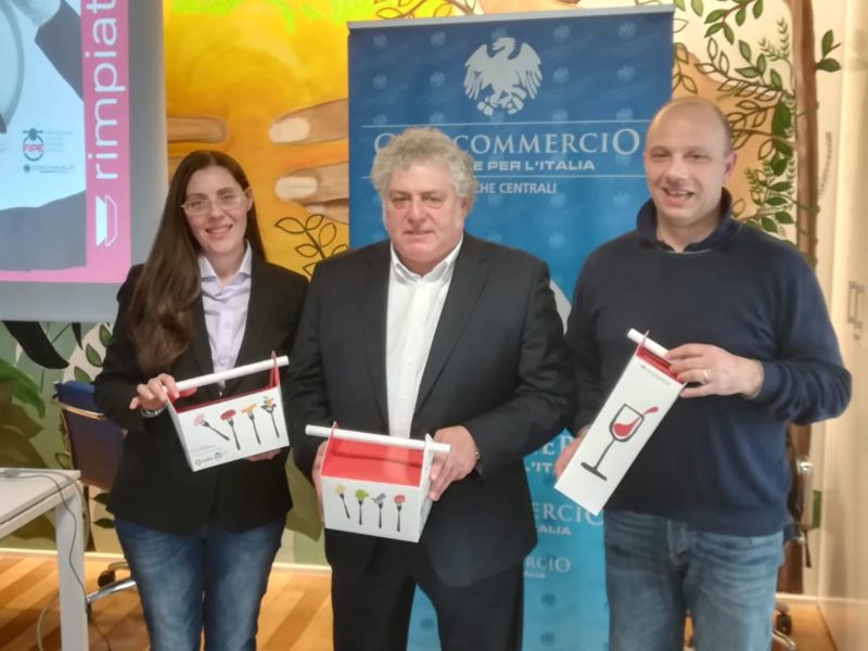 #Rimpiattino, la proposta di Fipe e Confcommercio contro lo spreco alimentare, arriva anche a Fabriano grazie a Osteria Mariani e Trattoria Marchegiana. I due ristoranti, hanno ricevuto in regalo, giovedì 7 marzo nella sede di Confidicoop Marche di Ancona, il kit #rimpiattino sia per il cibo che per il vino, da utilizzare nel proprio esercizio unito alla relativa vetrofania identificativa. Il progetto, attraverso il coinvolgimento diretto del mondo della ristorazione, si propone di fare del doggy bag (espressione idiomatica per indicare la confezione utile a portare a casa il cibo non finito di consumare al ristorante) una pratica sempre più consolidata nella cultura italiana. «È l’inizio di una nuova mentalità che va verso il consumatore, di una cultura dell’accoglienza»: queste le parole di introduzione del Direttore di Confcommercio Marche Centrali Massimo Polacco. A prendere la parola poi è stato il Presidente Fipe chef Moreno Cedroni che ha condotto una riflessione sullo spreco alimentare in un mondo in cui si dà sempre meno importanza a ciò che si mangia.