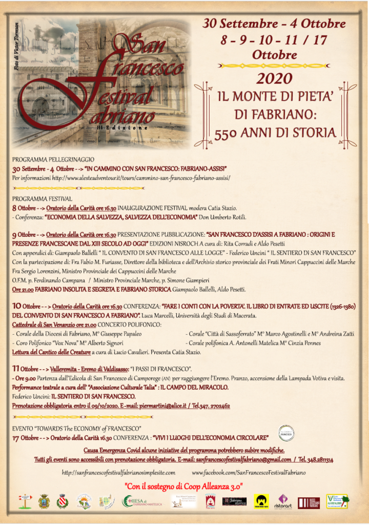 Affronteremo questa tematica con gli studiosi del nostro territorio contestualizzando il XV secolo a questo periodo di grandi incertezze, dove l’emergenza Covid-19 ci ha reso tutti più vulnerabili e consapevoli che il lavoro è servizio reciproco, è bene comune e che senza etica non c’è futuro per l’economia. Lo stesso tema di Papa Francesco dell’evento “Economy of Francesco” che dal 19-21 Novembre 2020 raccoglierà centinaia di giovani economisti da tutto il mondo per realizzare un “patto” e intraprendere un percorso che vede l’economia e la salvaguardia dell’ambiente, più concentrata ai principi etici e interessata allo sviluppo della qualità reale della vita delle persone.