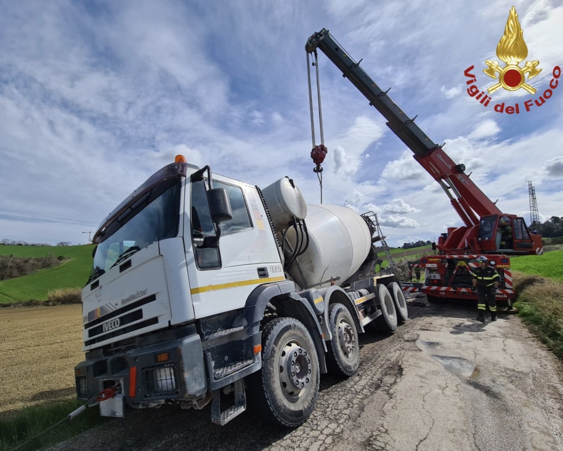 JESI (AN) – I vigili del fuoco sono intervenuti questa mattina, in via Colle Onorato a Jesi, per il recupero di una betoniera finita in una cunetta a lato strada.