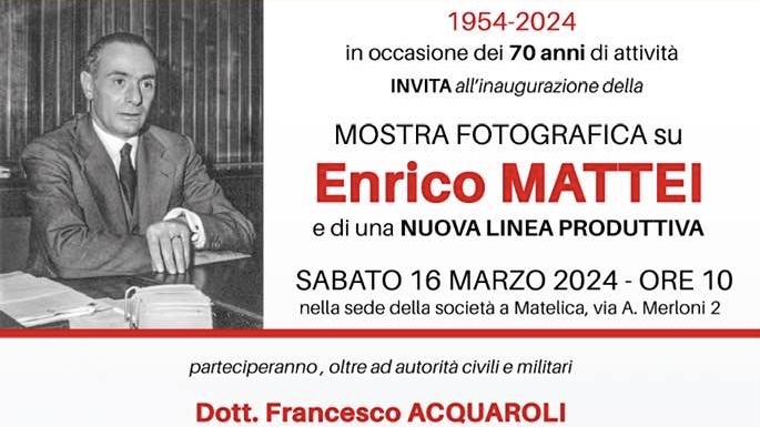 MATELICA – Importante visita istituzionale per la città di Matelica e altrettanto importante doppia inaugurazione presso l’azienda Antonio Merloni Pressure Vessels. Sabato 16 marzo alle ore 10 ci sarà infatti l’apertura di una mostra fotografica dedicata a Enrico Mattei presso la sede di via A. Merloni, 2. Fu proprio Mattei a volere lo stabilimento di produzione delle bombole a Matelica, aperto esattamente 70 anni fa nel 1954. Oltre alla mostra, verrà inaugurata anche la nuova linea produttiva della Antonio Merloni. Vista l’importanza del doppio evento, arriveranno a Matelica il ministro dell’Agricoltura Francesco Lollobrigida, il presidente della Regione Marche