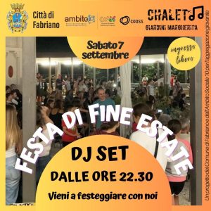 Fabriano- Appuntamento sabato 7 settembre allo Chalet dei Giardini Margherita per la festa di fine estata organizzata dal Comune di Fabriano, Ambito 10 e Unione Montana dell’Esino Frasassi in seno al “Progetto Chalet “in corso per questa stagione estiva. A partire dalle ore 22.30 musica, ballo e divertimento per festeggiare la fine dell’estate. Ingresso libero.
